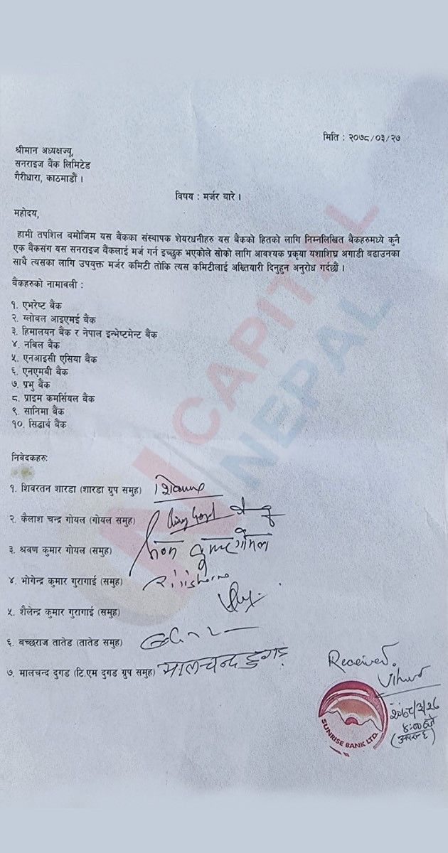 क्यापिटल नेपालले बैंक स्रोतबाट प्राप्त गरेको पत्रमा ठूला लगानीकर्ताले लिखित हस्ताक्षर गरेरै बैंकलाई मर्जमा लैजान दबाब दिएका छन् । लगानीकर्ताले एभरेष्ट, हिमालयन तथा इन्भेष्टमेन्ट, नबिल, सिद्धार्थ, एनआईसी एसिया, एनएमबी, ग्लोबल आइएमई, प्राइम कमर्सियल, प्रभू, सानीमामध्ये कुनै एक बैंकसँग मर्जमा सनराइजलाई लैजानुपर्ने भन्दै अध्यक्ष दुगडलाई लिखित दबाब दिएका हुन् ।