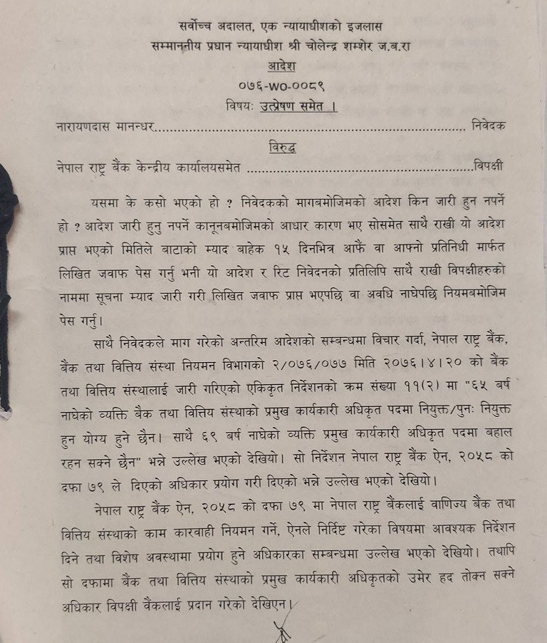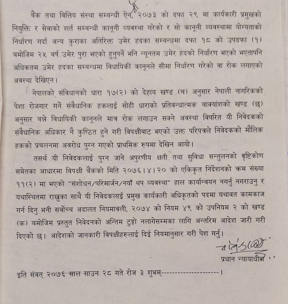 २०७६ साउन २० गते एकीकृत निर्देशन जारी गर्दै राष्ट्र बैंकले बैंक तथा वित्तीय संस्थाका सीईओ/सञ्चालकहरुको उमेर हद लागू गरेको थियो । तर, बैंकरहरु तत्कालै राष्ट्र बैंकको निर्देशनविरुद्ध सर्वोच्च अदालतमा गए ।