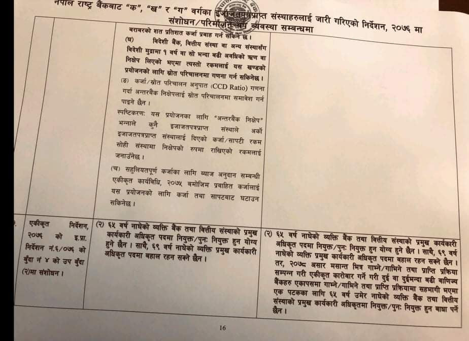राष्ट्र बैंकले जारी गरेको निर्देशनमा भने ६५ वर्ष नाघेको व्यक्ति बैंक तथा वित्तीय संस्थाको सीईओ नियुक्त÷पुनः नियुक्त हुन नसक्ने र ६९ वर्ष नाघेको व्यक्ति सीईओको रुपमा बहाल रहन नसक्ने व्यवस्था छ । तर, गाभ्ने/गाभिने तथा प्राप्ति प्रक्रिया सम्पन्न गरी एकीकृत कारोबार गर्ने गरी दुई वा दुईभन्दा बढी वाणिज्य बैंकहरु एकआपसमा गाभ्ने/गाभिने तथा प्राप्ति प्रक्रियामा सहभागी भएमा एक पटकका लागि ६५ वर्ष उमेर नाघेको व्यक्ति बैंक तथा वित्तीय संस्थाको सीईओमा नियुक्त/पुनः नियुक्त हुन बाधा नपर्ने उल्लेख छ ।