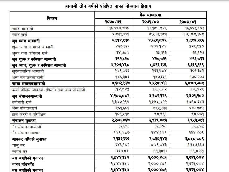 निक्षेप, कर्जा लगानीलगायत अन्य आम्दानी बढाएर प्रक्षेपित वित्तीय उपलब्धी हासिल गर्ने बैंकले जनाएको छ । ३ अर्ब रुपैयाँ बराबरको ऋणपत्र निष्कासन गरेपछि उसको व्यवसाय थप विस्तार हुनेछ । बैंकले सार्वजनिक गरेको ३ वर्षको प्रक्षेपित वित्तीय विवरणमा आर्थिक वर्ष ०७९÷०८९ मा २ अर्ब र आर्थिक वर्ष ०८०/०८१ मा २ अर्ब ७२ करोड रुपैयाँ खुदनाफा गर्ने उल्लेख छ ।