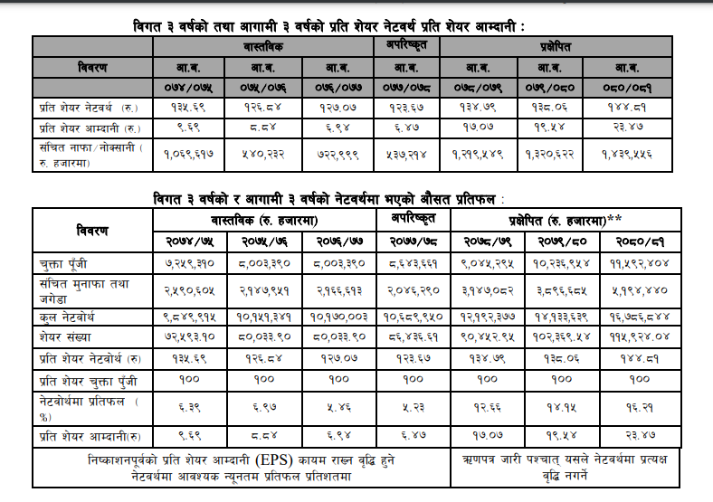 वित्तीय विवरण, प्रक्षेपणको अनुमान तथा आधार, हालको वित्तीय बजारको स्थिति, निष्कासनकर्ता कम्पनीको विगतका वर्षको कारोबार वृद्धि, भावी योजना एवम् शाखा सञ्जाल विस्तार गर्ने रणनीतिमा निर्भर रहेको बैंकले उल्लेख गरेको छ ।