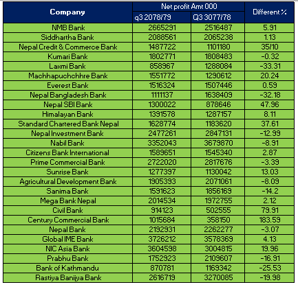 चालु आर्थिक वर्षको तेस्रो त्रैमासको वित्तीय विवरण सार्वजनिक गरेका २७ वाणिज्य बैंकमध्येका ११ बैंकको नाफमा घटेको छ । नबिल बैंक, कुमारी बैंक, नेपाल बैंक, प्राइम कमर्सियल बैंक, कृषि विकास बैंक, नेपाल इन्भेष्टमेन्ट बैंक, सानिमा बैंक, प्रभु बैंक, राष्ट्रिय वाणिज्य बैंक, बैंक अफ काठमाण्डू, नेपाल बंगलादेश बैंक र लक्ष्मी बैंकको खुदनाफा घटेको छ ।