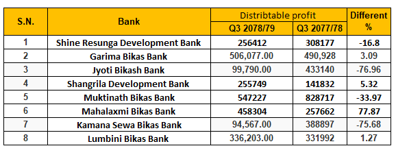 चैत मसान्तसम्म ४ विकास बैंकको वितरणयोग्य नाफा घटेको छ । यस अवधिमा कामना सेवा, ज्योति विकास, साइन रेसुंगा र मुक्तिनाथ विकास बैंकको वितरण योग्य नाफा घटेको छ भने गरिमा, महालक्ष्मी, लम्बिनी र सांग्रिला डेभलपमेन्टको वितरणयोग्य नाफा बढेको छ ।