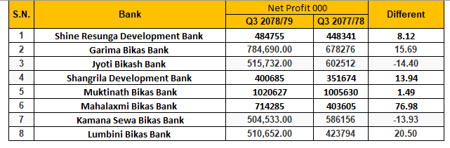 उल्लिखित ८ विकास बैंकमध्ये ६ बैंकको नाफा बढ्दा कामना सेवा विकास बैंक र ज्योति विकास बैंकको घटेको छ । मुक्तिनाथ, गरिमा, महालक्ष्मी, लम्बिनी, साइन रेसुंगा र सांग्रिलाको नाफा बढेको छ ।