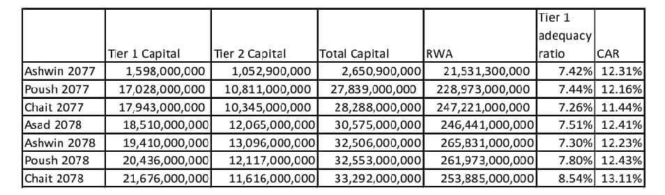केन्द्रीय बैंक स्रोतका अनुसार २०७८ असारमा ‘टायर वान क्यापिटल’ १८ अर्ब ५१ करोड रुपैयाँ थियो । त्यो बेला ‘टायर टु क्यापिटल’ १२ अर्ब ६५ लाख र कुल क्यापिटल ३० अर्ब ५७ करोड रुपैयाँ थियो । त्यस बेला टायर वान एडुकेसी रेसियो ७.५१ प्रतिशत थियो ।