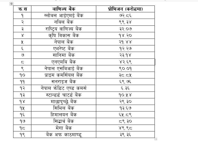 काठमाडौं। चालू आर्थिक वर्षको पहिलो त्रैमासमा १९ वाणिज्य बैंकले ८ अर्ब २२ करोड रूपैयाँ कर्जा नोक्सानी बापत (प्रोभिजन) छुट्याएका छन्।