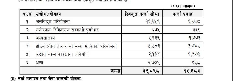 जसमध्ये जलविद्युतमा १६ अर्ब ६५ करोड ९० लाख, मनोरञ्जन तथा रिक्रिएसन पूर्वाधार ६७ करोड ५० लाख, अस्पताल ५ अर्ब १३ करोड, तीनतारे माथिका होटल ५ अर्ब ५८ करोड, उद्योग–कलकारखाना २ अर्ब १३ करोड र अन्यमा २ अर्ब ७० करोड ९० लाख रुपैयाँ ऋण लगानी स्वीकृत गरेको निफ्राले जनाएको छ।