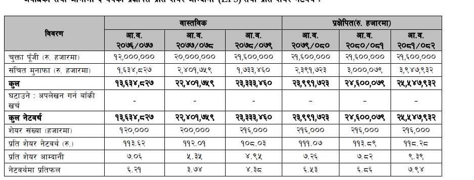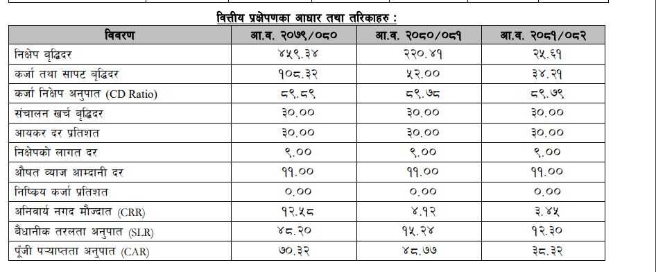 यस्तै बैंकले कर्जा निक्षेप अनुपात, सञ्चालन खर्च वृद्धिदर, निष्क्रिय कर्जा प्रतिशत, अनिवार्य नगद मौज्दात, बैधानिक तरलता अनुपात तथा पुँजीकोष अनुपातका साथै नेपाल राष्ट्र बैंकले तोकेको मापदण्डअनुसार कायम गरी वित्तीय विवरण प्रक्षेपण गरेको हो।