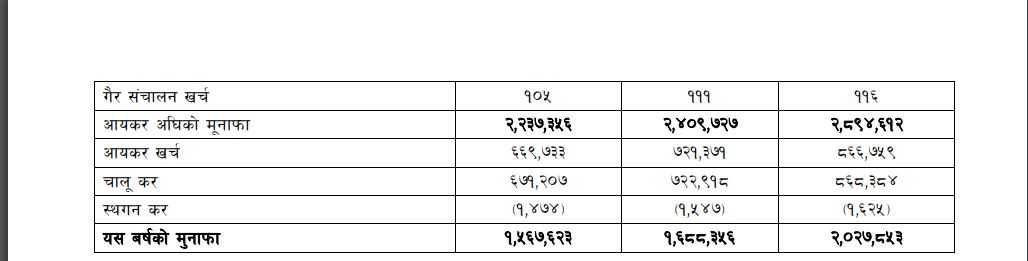 यस्तै बैंकको निक्षेप वृद्धिदर ४ सय ५९ प्रतिशत बढ्ने अनुमान छ। यस्तै आगामी वर्ष २ सय २० र तेस्रो वर्ष २५.६१ प्रतिशत पुग्ने अनुमान छ। कर्जा सापटी वृद्धिदर यो वर्ष १ सय ८, आगामी वर्ष ५२ र तेस्रो वर्ष ३४ प्रतिशत बढ्ने अनुमान छ। पछिल्ला तीन वर्षमा निफ्राको नेटवर्थमा भएको औसत प्रतिफल ४.७८ रुपैयाँ छ। यो वर्ष नेटवर्थको औसत प्रतिफल ६.५३, ६.८६ र तीन वर्षमा ७.९४ प्रतिशत पुग्ने अनुमान छ।