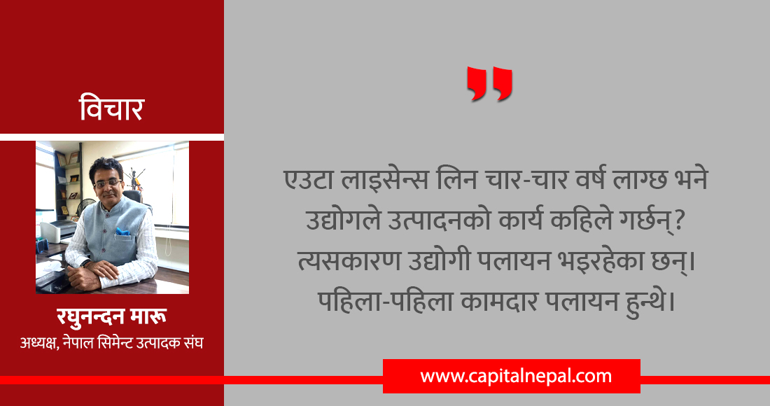 एउटा खानीको लाइसेन्स लिन तीन-तीन वर्षसम्म लाग्छ। आईईई सबै गराएर मात्रै भोगाधिकार लिनुपर्ने मापदण्ड छ। ९० प्रतिशत खानी वन क्षेत्रमै छन्। भोगाधिकारका लागि फेरि अर्को डेढ-दुई वर्ष लाग्छ। यसरी एउटा लाइसेन्स लिन चार-चार वर्ष लाग्छ भने उद्योगले उत्पादनको कार्य कहिले गर्छन्? त्यसकारण उद्योगी पलायन भइरहेका छन्। पहिला-पहिला कामदार पलायन हुन्थे, अहिले उद्योगी पलायन हुन थालिसकेका छन्।