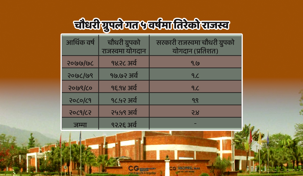 राजनीतिक अस्थिरता, सुस्त आर्थिक गतिविधि तथा चुनौतीपूर्ण लगानीको पृष्ठभूमिमा पनि चौधरी ग्रुपले सरकारको राजश्वमा उल्लेखनीय योगदान पुर्याएको छ। गत आर्थिक वर्ष २०८०/८१ मा १८.५२ अर्ब कर तिरेको चौधरी ग्रुपले यस वर्ष ७ अर्ब बढी कर राज्य ढुकुटीमा दाखिला गरेको छ, जसले चौधरी ग्रुपको लगानी वृद्धि तिव्र गतिमा रहेको प्रष्ट पार्छ।