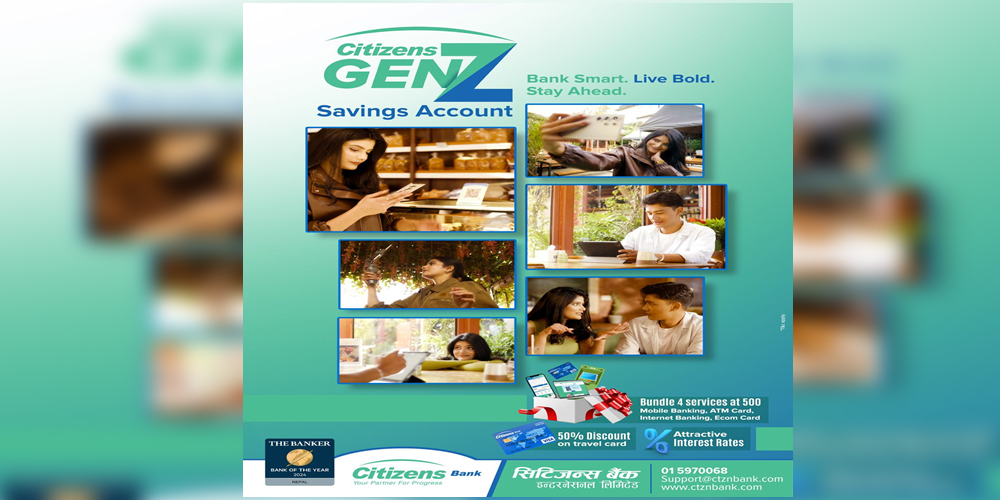 काठमाडौं। सिटिजन्स बैंक इन्टरनेसनलले नवयुवा लक्षित बचत खाता ‘सिटिजन्स जेन–जी सेभिङ अकाउन्ट’ सञ्चालनमा ल्याएको छ । बैंकका प्रमुख कार्यकारी अधिकृत गणेशराज पोखरेलले सिटिजन्स जेनजी सेभिङ अकाउन्ट प्रारम्भ गरेका हुन्।