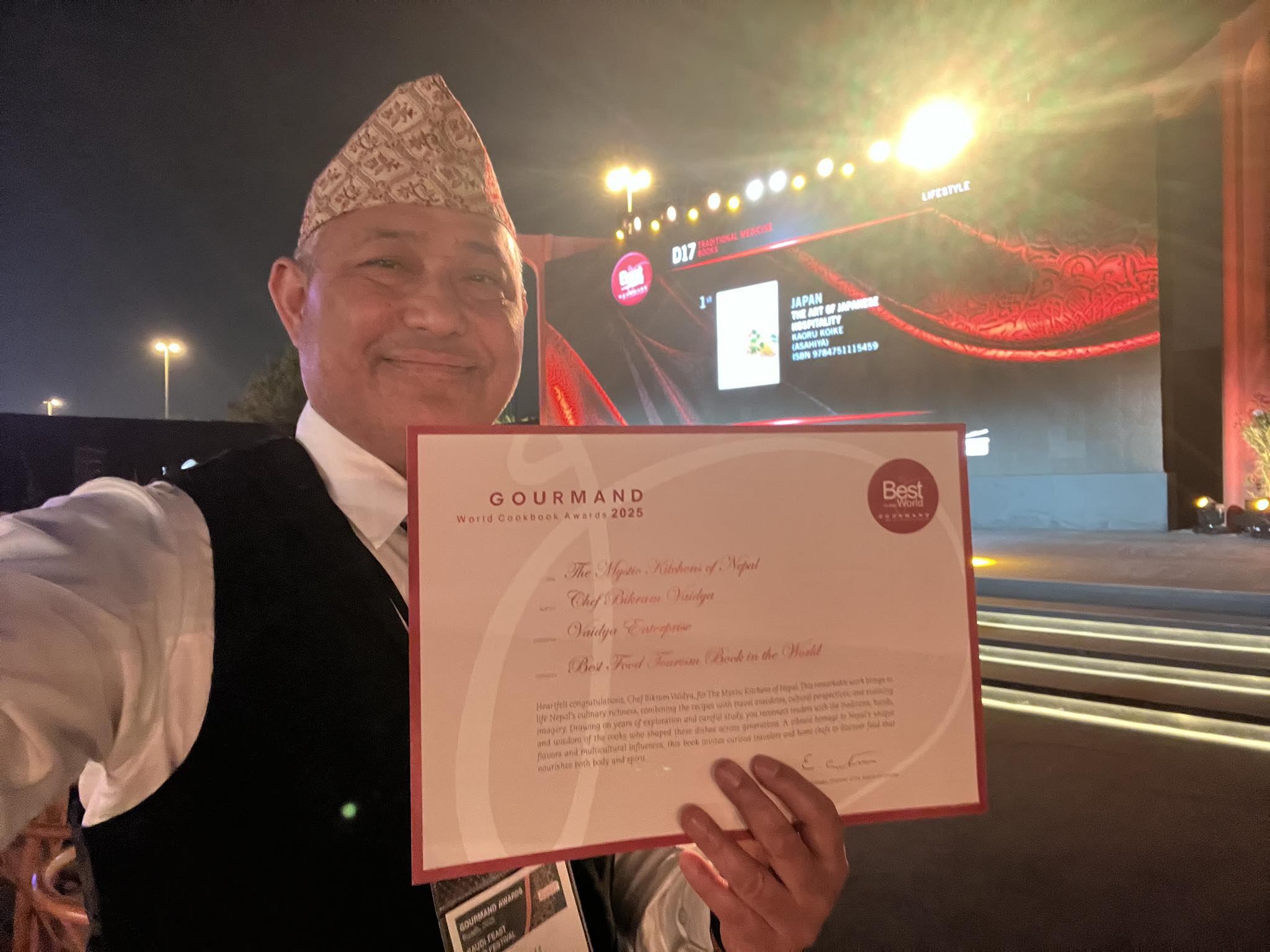 काठमाडौं। नेपालले अन्तर्राष्ट्रिय पाक साहित्य क्षेत्रमा अभूतपूर्व सफलता हासिल गरेको छ। प्रसिद्ध पाकविज्ञ तथा प्रशिक्षक शेफ विक्रम वैद्यद्वारा लिखित कुकबुक ‘द मिस्टिक किचेन्स अफ नेपाल’ले रियादमा सम्पन्न ३१ औं गोरमान्ड अवार्ड २०२४ मा ‘विश्वको उत्कृष्ट खाद्य पर्यटन कुकबुक’को उपाधि जित्दै देशलाई विश्व मञ्चमा नयाँ पहिचान दिलाएको हो।