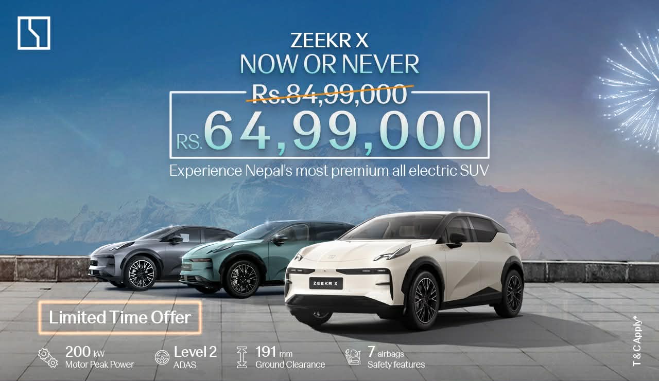 क्रिसमस तथा नयाँ वर्षलाई लक्षित गर्दै ल्याइएको यो विशेष प्रिमियम अफरले नेपालकै सबैभन्दा अत्याधुनिक पूर्ण–इलेक्ट्रिक प्रिमियम एसयुभी लिन चाहने ग्राहकहरूका लागि आकर्षक अवसर प्रदान गर्दछ। लक्जरी इलेक्ट्रिक मोबिलिटीलाई आम ग्राहकको पहुँचसम्म पुर्याउन प्रिमियम इलेक्ट्रिक एसयुभी जीकर एक्सको मूल्य घटाइएकाे कम्पनीले जनाएकाे छ।