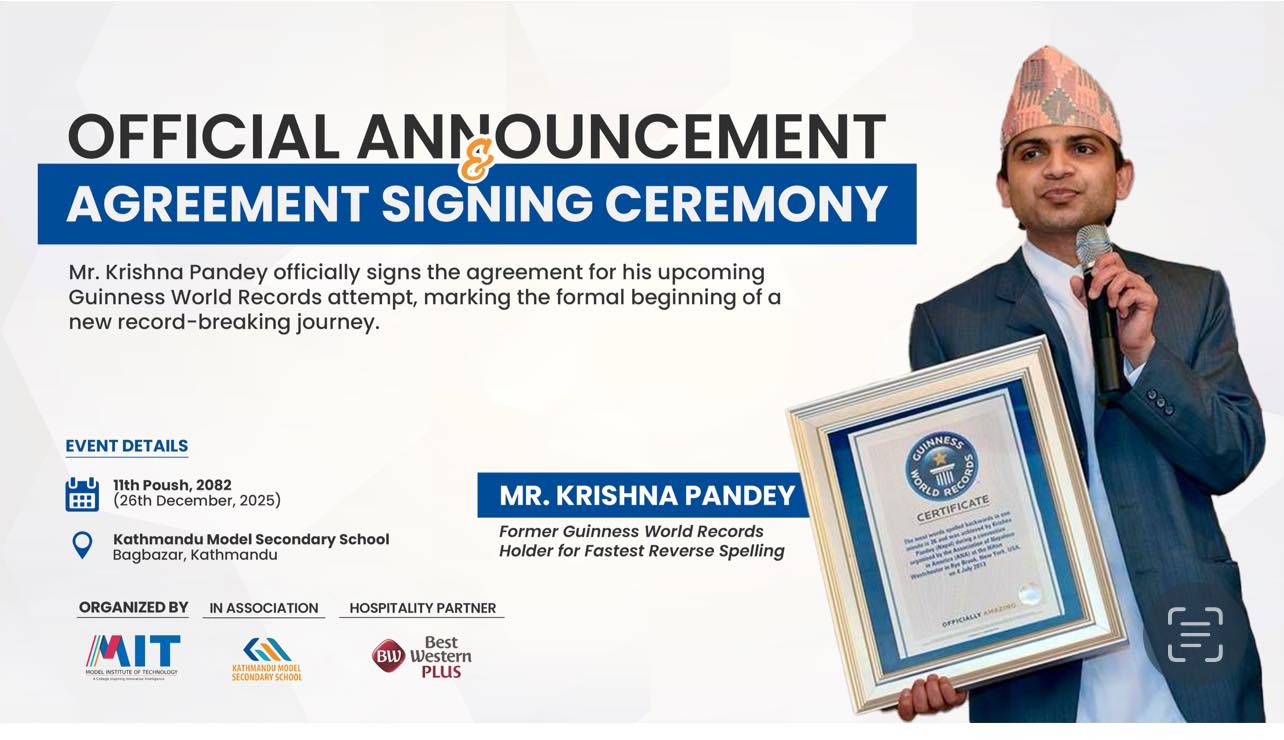 काठमाडौं। बागबजारस्थित मोडेल इन्स्टिच्युट अफ टेक्नोलोजी (एमआईटी) कलेज को आयोजनामा पूर्व गिनिज वर्ल्ड रेकर्डधारी तथा प्रख्यात मेमोरी एथ्लेट कृष्ण पाण्डेय ले माघ ६ गते गिनिज वर्ल्ड रेकर्डको नयाँ प्रयास गर्ने भएका छन्। उक्त प्रयास काठमाडौं मोडेल सेकेन्डरी स्कूल (केएमएसएस) बागबजारमा सम्पन्न हुनेछ।
