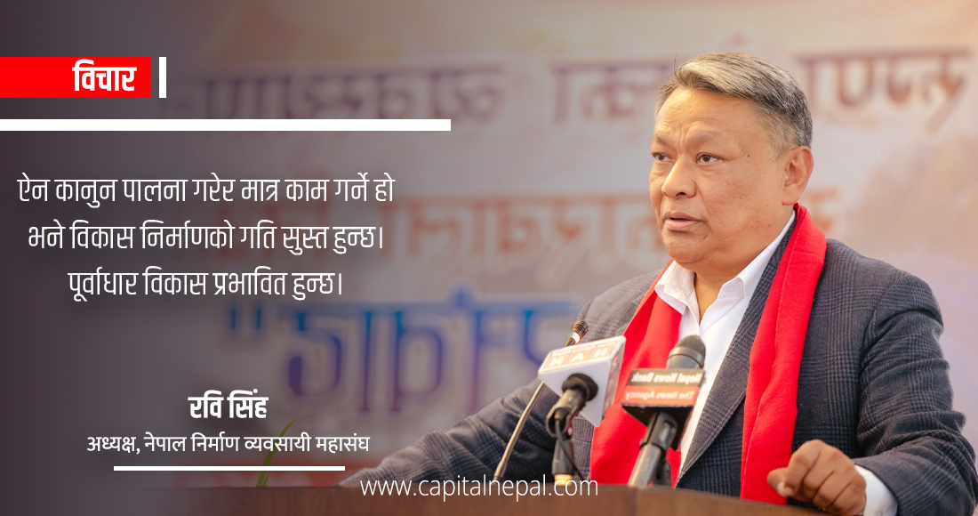 निर्वाचनमा जाने र सरकार बनाउनेले सबैभन्दा पहिले ऐन कानुन कार्यान्वयन योग्य बनाउने प्राथमिकता लिनु पथ्र्यो। निर्माण क्षेत्रमा मात्र होइन, हरेक क्षेत्रमा यो आवश्यक छ। निर्माणको हकमा एउटा ‘छाता ऐन’ बनाएर अन्य ऐनको कमजोरी पहिचान गरी पुँजीगत खर्च, रोजगारी सिर्जना र विकासलाई प्रभावकारी बनाउनुपर्छ।
