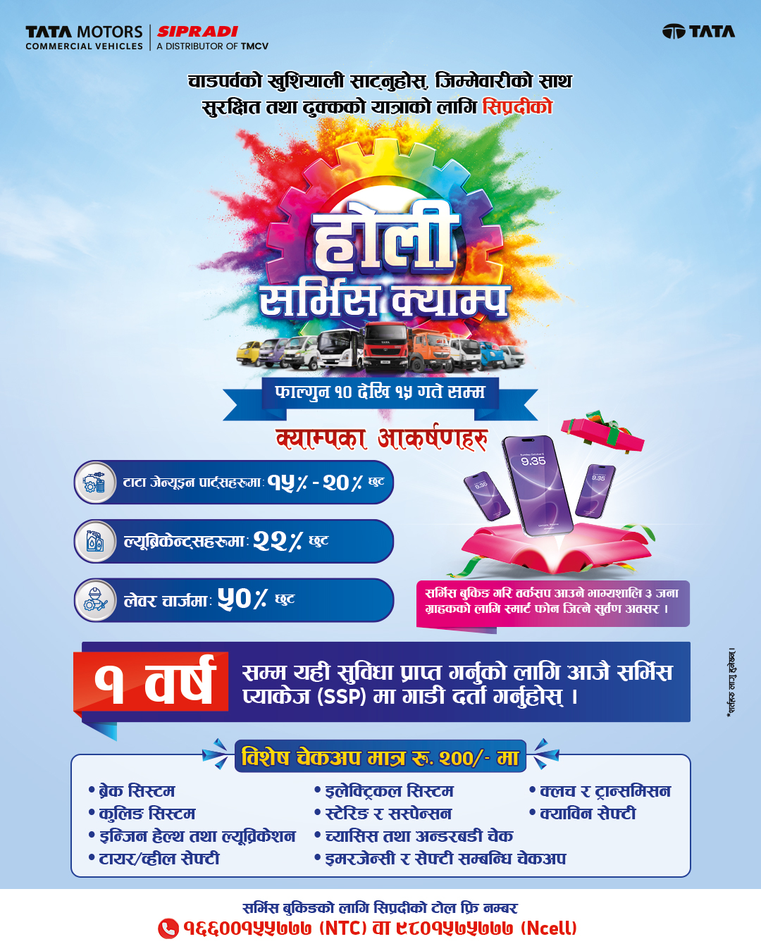काठमाडौं। होली पर्वलाई लक्षित गर्दै टाटा मोटर्स का आधिकारिक वितरक सिप्रदी ट्रेडिङ ले कमर्सियल सवारी साधनका लागि विशेष ‘होली सर्भिस क्याम्प’ सुरु गरेको छ। सुरक्षित यात्रा र सवारी साधनको उच्च कार्यक्षमता सुनिश्चित गर्ने उद्देश्यले फागुन १० देखि १५ गतेसम्म सञ्चालन हुने क्याम्प देशभरका सिप्रदीका २० वटा सर्भिस सेन्टरमा एकै साथ आयोजना गरिएको कम्पनीले जनाएको छ।