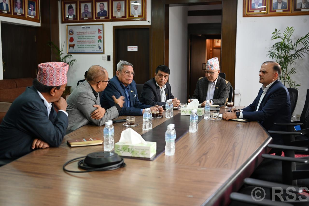 काठमाडौं। अर्थमन्त्री रामेश्वरप्रसाद खनाल र निजी क्षेत्रका प्रतिनिधिबीच छलफल भएको छ। आज अर्थ मन्त्रालयमा आयोजित छलफलमा नेपाल उद्योग वाणिज्य महासंघका अध्यक्ष चन्द्रप्रसाद ढकाल, नेपाल चेम्बर्स अफ कमर्सका अध्यक्ष कमलेशकुमार अग्रवाल, नेपाल उद्योग परिसंघका अध्यक्ष विरेन्द्रराज पाण्डे तथा नेपाल उद्योग व्यापार महासंघका अध्यक्ष खेमराज भण्डारीलगायतको उपस्थिति थिए।