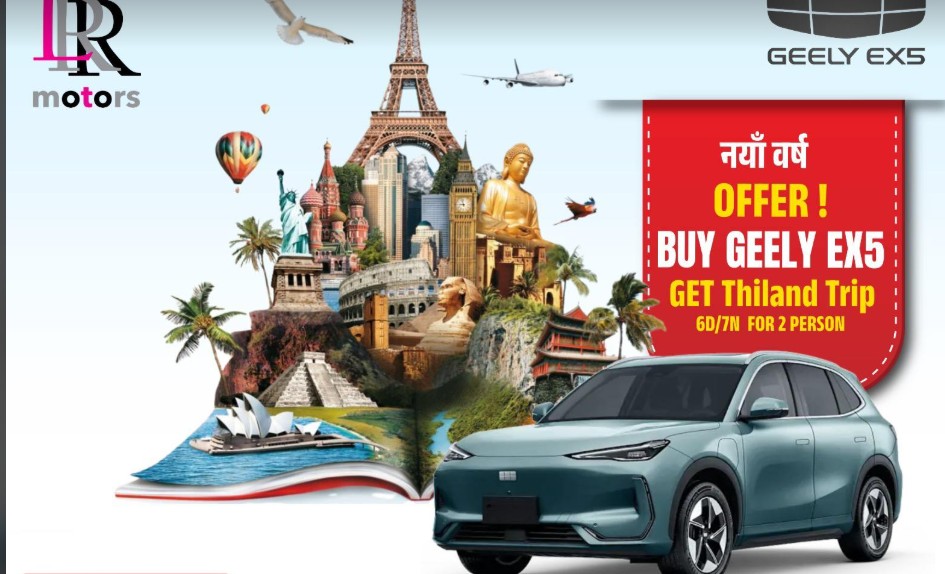 काठमाडौं। नेपाली नयाँ वर्ष २०८३ को अवसर पारेर एलआरआर मोटर्स प्रा.लि.ले आफ्नो प्रिमियम इलेक्ट्रिक एसयूभी जिली ईएक्स ५ म्याक्समा आकर्षक नयाँ वर्ष विशेष बिक्री योजना 'नयाँ ऊर्जा, नयाँ यात्रा र नयाँ अनुभव' सार्वजनिक गरेको छ।