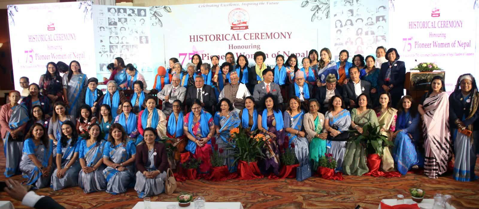 नेपाल चेम्बर अफ कमर्सको हीरक जयन्ती अवसर नेपाल महिला चेम्बरद्वारा आयोजित विशेष कार्यक्रममा प्रथम राष्ट्रपति रामवरण यादव, नेपाल महिला चेम्बरका अध्यक्ष उर्मिला श्रेष्ठ, नेपाल चेम्बर अफ कमर्स हीरक जयन्ती समारोह समितिका अध्यक्ष राजेशकाजी श्रेष्ठ र नेपाल चेम्बर अफ कमर्सका अध्यक्ष कमलेशकुमार अग्रवालले संयुक्त रुपमा विभिन्न क्षेत्रहरूमा ऐतिहासिक योगदान पुर्याएका महिलालाई विशेष सम्मान गरेका हुन्।