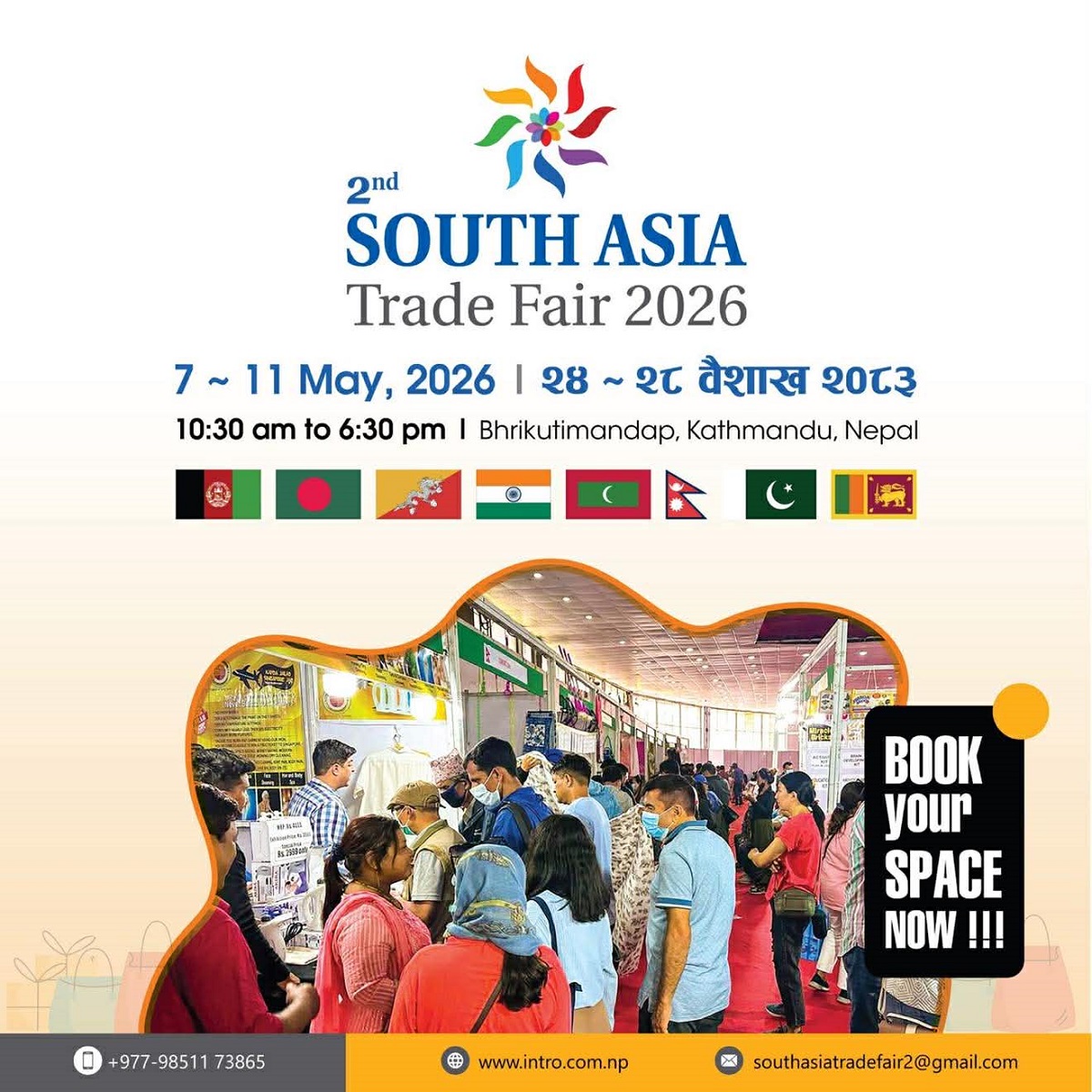 काठमाडौं। दक्षिण एसिया क्षेत्रका उद्योग, व्यापार तथा सेवासम्बन्धी अवसरहरूलाई एकै थलोमा ल्याउने उद्देश्यसहित ''साउथ एसिया ट्रेड फेयर २०२६'' आगामी ७ देखि ११ मे २०२६ (वैशाख २४ देखि २८) सम्म काठमाडौंमा आयोजना हुने भएको छ। मेला भृकुटीमण्डपस्थित प्रदर्शनी हलमा सञ्चालन हुनेछ।