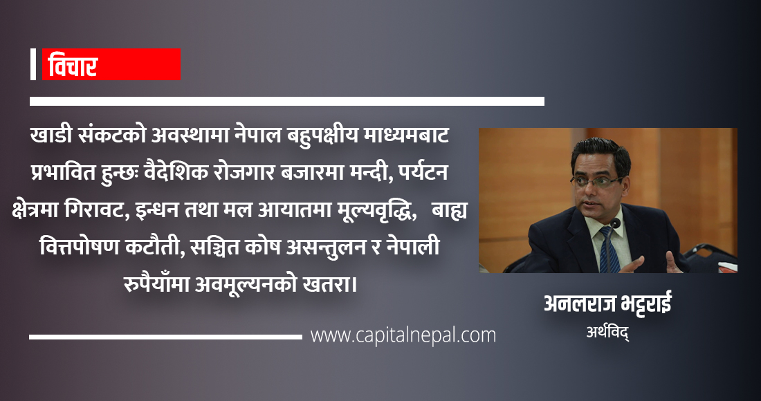 खाडी संकटको अवस्थामा नेपाल बहपक्षीय माध्यमबाट प्रभावित हुन्छः वैदेशिक रोजगार बजारमा मन्दी, पर्यटन क्षेत्रमा गिरावट, इन्धन तथा मलजस्ता आयातमा मूल्यवृद्धि, बाह्य वित्तपोषण कटौती, सञ्चित कोष असन्तुलन, मूल्यवृद्धि दबाब र नेपाली रुपैयाँमा अवमूल्यनको खतरा। खाडी संकटको गम्भीर अवस्थामा ५ लाख ४० हजारदेखि ९ लाखसम्म श्रमिकको रोजगारी गुम्न सक्छ र विप्रेषण तीव्र रूपमा घट्न सक्छ, जसले भुक्तानी सन्तुलनमा समेत दबाब पार्न सक्छ।